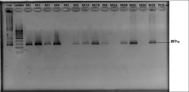 Fig. 1. Gel Image for detection of L. monocytogenes by nested PCR. Lane +ve represents L. monocytogenes ATCC 51776 (the positive control for the target gene), Lanes M1 to M10 correspond to samples from Meepe 1 to Meepe 10 respectively and the lane PCR -ve represents the negative control for PCR with Milli-Q water.