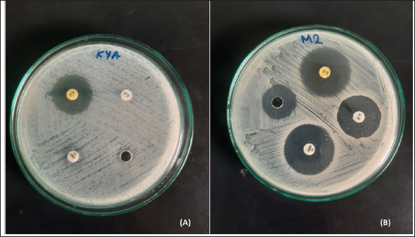 Fig. 2. Listeria monocytogenes isolate from (A)—K4A sample, (B)—M2 sample on Mueller Hinton agar with antibiotic disks (A) Penicilin—G, (B) Ampicilin, (C) Tetracycline, (D) Streptomycin. Factors influencing farmers’ milking practicesInformation regarding dairy farming practices from the farmers who carry milk for the five milk collection centers were also analyzed in this study (Table 3). Manual milking is universally practiced (100%), while mechanical milking remains unused (0%). Hygiene standards during milking show a predominance of water usage (90.90%) over soap (9.10%). Daily bathing of cows is common (80%), and sheds are typically washed weekly (50%). Wells (63.60%) and tap water (27.30%) are the primary sources for washing, indicating accessibility and quality as important factors. Cows predominantly graze in pastures (36.40%), with a notable presence near rivers (27.30%), highlighting potential environmental contamination risks. These results underscore the necessity for targeted interventions to enhance hygiene practices and minimize contamination risks in dairy farming. DiscussionThe widespread use of antibiotics in recent years has led to occasional misuse in both humans and animals. Therefore, this plays a vital role in the development and distribution of resistance to antibiotics among foodborne bacteria such as L. monocytogenes. Notably, antibiotic consumption has been substantial in Sri Lanka, as evidenced by a survey conducted by Sri Ranganathan et al. in (2021), which reported a high antibiotic consumption rate and the disproportionate use of broad-spectrum antibiotics. Antibiotics are also widely employed in animal husbandry to prevent infections and promote growth. In Sri Lanka, poultry and livestock farms serve as reservoirs of antibiotic-resistant bacteria, with commonly used antibiotics including tetracycline, ampicillin, oxytetracycline, and penicillin (Liyanage and Pathmalal, 2017). Although L. monocytogenes can be transmitted through various food sources, the contamination of milk and milk products with is particularly critical globally, especially in developing countries like Sri Lanka. Despite the severity of this challenge, only a handful of reports have investigated the presence of L. monocytogenes in dairy products in Sri Lanka. Previous studies have highlighted higher percentages of L. monocytogenes-contaminated milk samples (Wijesundera et al., 1992; Jayamanne and Samarajeewa, 2001; Wijendra et al., 2014; Harshani et al., 2022).