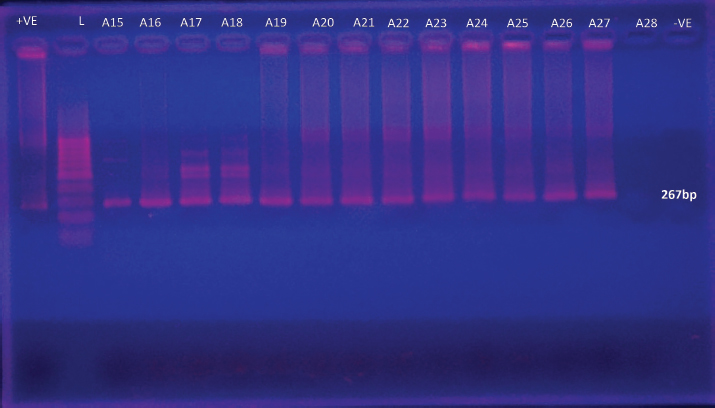 Supplementary Fig. 2. Gel Image for detection of L. monocytogenes by nested PCR. Lane +ve represents L. monocytogenes ATCC 51776 (the positive control for the target gene), Lane L- Ladder, Lanes A15 to A28 correspond to samples from Awissawella 15 to Awissawella 28 respectively and the lane PCR −ve represents the negative.