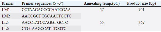AbstractBackground: Listeria monocytogenes, a foodborne pathogen, poses a significant risk to public health due to its potential to cause severe infections termed “listeriosis”. Raw milk and dairy products are common vehicles for L. monocytogenes transmission, amplifying the risk to consumers. Additionally, the emergence of antibiotic resistance in Listeria strains heightens concerns in human and veterinary medicine. Aim: This study aimed to assess the prevalence of L. monocytogenes in raw milk samples from Sri Lanka’s Colombo district and to characterize the antibiotic resistance patterns of positive isolates. Methods: One hundred raw milk samples were collected from various milk collection centers. Samples were sourced from locations including Awissawella, Kahanthota, Meepe, Homagama, and Udahamulla. Antibiotic resistance was evaluated using standard methods like disk diffusion and well diffusion, testing ampicillin, penicillin, streptomycin, and tetracycline. Results: Of the 100 samples, L. monocytogenes was detected by conventional PCR in 83, with Awissawella having the highest occurrence (100%), followed by Kahanthota (81.81%), Meepe (81.48%), Homagama (77.27%), and Udahamulla (44.44%). Among the positive samples, 72 showed varying degrees of antibiotic resistance. The highest level of resistance was observed for penicillin (83.1%), followed by ampicillin (65%), streptomycin (32.53%), and tetracycline (10.84%). Sixty isolates (60%) displayed resistance to more than one antibiotic studied. Findings also revealed the widespread manual milking, predominant water usage over soap for hygiene, and common daily bathing of cows, highlighting the need for improved hygiene practices to minimize contamination risks in dairy farming. Conclusion: Raw milk contaminated with L. monocytogenes pose a serious public health risk. The study highlights the need for stringent hygiene measures in milk production and processing to safeguard consumers. Additionally, the high prevalence of antibiotic-resistant strains underscores the importance of judicious antibiotic use in both human and veterinary medicine to mitigate the further emergence and spread of resistant Listeria strains. Keywords: Antibiotic resistance, Listeria monocytogenes, Raw milk, PCR, Antibiotic Susceptibility Testing. IntroductionListeria monocytogenes is a microaerophilic, Gram-positive pathogen, which is a member of the Listeriaceae family comprising 20 species (Nwaiwu, 2020). Among them, L. monocytogenes is the sole pathogenic species, posing significant risks to both human and animal health. It is very adaptable to a wide range of environmental settings, including acidity (pH) between 4.3 and 9.6, water activity at approximately 0.83, and salt concentrations of up to 10% (Shamloo et al., 2019). Listeria are also able to proliferate in low-temperature environments such as fridges where most foods are believed to be safe from most pathogens (Osek et al., 2022). As a result, it is ubiquitously present in diverse ecosystems, including soil, water, and a variety of food products. Listeria can establish chronic infections and persist in varied conditions within the digestive system (Gahan et al., 2014). The infection induced by L. monocytogenes is referred to as listeriosis, and is primarily induced through the ingesting of infected foods (Liu et al., 2005). Listeriosis outbreaks have a notably high fatality rate, ranging from 20% to 30%. This fatality rate is significantly higher when compared to other common foodborne diseases like Salmonella enteritidis (0.38% mortality), Vibrio spp. (0.005%–0.01% mortality), and Campylobacter spp (0.02%–0.1% mortality) (EFSA and ECDC, 2021). Listeriosis is a disease with severe health implications. It comprises two forms: non-invasive and invasive. Non-invasive listeriosis is a milder form of this illness that typically impacts healthy individuals. Symptoms include diarrhea, muscle ache, fever, and headache, with a relatively brief incubation time lasting only a few days. In contrast, invasive listeriosis represents a more fatal variant of the condition, primarily impacting vulnerable groups such as pregnant mothers, individuals with cancer, those with HIV, organ transplant recipients, the elderly, and newborns (Hilliard et al., 2018). Common symptoms consist of muscle ache, fever, septicemia, and meningitis, with a longer incubation period of 1–2 weeks. Moreover, L. monocytogenes outbreaks are often linked to contaminated dairy products resulting in fatalities and substantial economic losses. Raw milk has been linked to recorded incidences of contamination caused by mastitis in lactating cows as a potential source of L. monocytogenes infection. Despite the ability of pasteurization to lower the risk of infection, incidents of milk contamination have been reported, emphasizing that the threat cannot be completely eliminated even after pasteurization (Lyytikäinen et al., 2006). This situation poses a significant global challenge, particularly in developing countries like Sri Lanka. Beyond the threat posed by L. monocytogenes, antibiotic resistance has become a pressing global concern. The extensive usage of antibiotics has played a major role in developing resistance to antibiotics in humans as well as animals (Imperial and Ibana, 2016; Agyare et al., 2018). When a bacterial pathogen becomes resistant to antibacterial therapy, it can delay the administration of appropriate treatment, and the antibiotics needed to combat resistant pathogens may lose their effectiveness or become toxic. It is estimated that overall deaths caused due to antibiotic-resistant bacterial 17 infections could surge between 700,000 and 10 million every year, with associated expenses exceeding $100 trillion by 2050 (Olaimat et al., 2018). Listeria species display inherent resistance to specific antibiotics, such as fosfomycin, first-generation quinolones, cephalosporin, and sulfamethoxazole (Troxler et al., 2000; Cont