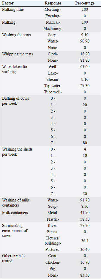 In the current study, conventional PCR was carried out for the identification of L. monocytogenes. The authors chose two-step nested PCR amplification to confirm the presence of the Listeriolysin O (LLO) gene in L. monocytogenes due to its high specificity and sensitivity. Nested PCR involves two sets of primers: the first set amplifies a larger region of DNA containing the target gene, and the second set amplifies a smaller region within the product of the first PCR. This increases the specificity of the amplification, reducing the likelihood of non-specific amplification. Targeting the LLO gene specifically is crucial because it is a virulence factor associated with L. monocytogenes pathogenicity. Confirming its presence helps in identifying the pathogenic potential of the strain being studied. The high rate of contamination of L. monocytogenes in raw milk might be due to poor sanitation practices among milking cows and due to corn silage and other cow feed being contaminated with L. monocytogenes, which could infect cows through ingestion (Husu et al., 1990). Another aspect of udder cleanliness is drying the udders with a cloth before milking. Failure to do so may result in bacterial cells being washed into the milk by water running down the udder skin into the milk container (Moroni et al., 2018). Therefore, drying the udders with a cloth before milking is important for avoiding or minimizing contamination. The source of water used for washing cows and sheds is also crucial. Ground and surface water resources are commonly used, but they may be contaminated with pathogenic bacteria, increasing the risk of contamination. Additionally, the use of tanks for washing cows may contribute to L. monocytogenes contamination, as this bacterium often inhabits moist soil and water (Singh et al., 2020). Finally, the cleanliness of milking equipment, particularly the way milk containers are washed, is vital. While most farmers use soap to clean containers, a small percentage relies solely on water for cleaning. The combined influence of these factors leads to the contamination of L. monocytogenes in raw milk, emphasizing the need to improve sanitation practices among milking cows and their environments (Husu et al., 1990). The analysis several critical factors that could influence the risk of L. monocytogenes contamination in raw milk were also analyzed in this study. Manual milking, which is practiced by 100% of farmers surveyed, may pose a higher risk compared to mechanical milking, as it involves more direct contact between the milker and the animal, potentially introducing contaminants. Furthermore, the relatively low usage of soap (9.10%) during teat washing suggests potential shortcomings in cleaning practices, which could contribute to the persistence of L. monocytogenes. Additionally, the frequency of bathing cows and washing sheds per week is a significant factor, as inadequate cleaning may lead to the buildup of L. monocytogenes in the environment. The choice of water source for washing is also crucial, particularly if sourced from rivers (27.30%) or wells (63.60%), as these may be susceptible to environmental contamination. Overall, these findings underscore the importance of implementing stringent hygiene protocols, including thorough teat washing with effective disinfectants, regular cleaning of cow sheds and equipment, and ensuring the quality and safety of water sources to minimize the risk of L. monocytogenes contamination in raw milk. The comprehensive examination of antibiotic use, antibiotic resistance patterns, and factors influencing L. monocytogenes contamination in raw milk underscores the complexity of ensuring food safety and public health in dairy production. The widespread use and misuse of antibiotics, coupled with inadequate sanitation practices and environmental contamination, pose significant challenges in mitigating the risk of L. monocytogenes contamination in raw milk. Addressing these multifaceted issues requires collaborative efforts among stakeholders, including policymakers, farmers, healthcare professionals, and researchers. Implementing stringent hygiene protocols, promoting responsible antibiotic use in both human and animal healthcare, and enhancing surveillance and monitoring systems are imperative steps towards minimizing the risk of L. monocytogenes contamination in raw milk. By prioritizing these measures, we can safeguard the integrity of our food supply chain and protect consumers from potential health hazards associated with L. monocytogenes contamination in dairy products. ConclusionIn conclusion, the comprehensive analysis of dairy farming practices, antibiotic use, antibiotic resistance patterns, and factors influencing L. monocytogenes contamination in raw milk underscores the multifaceted nature of ensuring food safety and public health in dairy production. The widespread use and misuse of antibiotics, coupled with inadequate sanitation practices and environmental contamination, pose significant challenges in mitigating the risk of L. monocytogenes contamination in raw milk. Addressing these challenges requires concerted efforts from various stakeholders, including policymakers, farmers, healthcare professionals, and researchers. Implementing stringent hygiene protocols, promoting responsible antibiotic use, enhancing surveillance and monitoring systems, and improving sanitation practices are crucial steps towards minimizing the risk of L. monocytogenes contamination in raw milk. By prioritizing these measures, we can safeguard the integrity of our food supply chain and protect consumers from potential health hazards associated with L. monocytogenes contamination in dairy products. AcknowledgmentThe authors would like to express their sincere gratitude to the Department of Molecular Biology, Medical Research Institute, Sri Lanka. The authors are also thankful to Medical Research Institute and Ministry of Health, Sri Lanka for the financial suppo