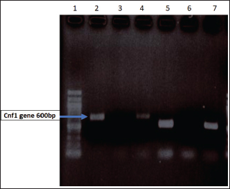Fig. 1. Distribution of Cnf gene E. coli Isolates. Lane 1 Molecular Marker 100bp ladder. Lane 2 Positive amplification band represents the presence of Cnf; Lanes 4, 5, and 7 the gene size was approx. 580 bp.