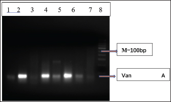 Fig. 3. Distribution of the Van A gene among the E. faecalis isolates. M, 100-bp DNA marker; Lane 1 (1–7) represents the presence of Van A gene (300 bp).