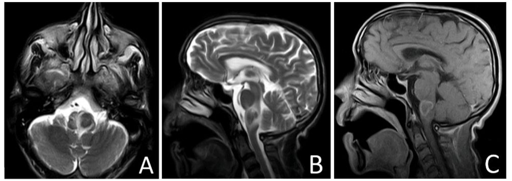 Fig. 2. Axial T2 (A), Sagittal T2 (B) and Sagittal (T1 post contrast) images of the brain taken after 9 months of anti TB medication showing a complete resolution of the medullary lesion. DiscussionCNS TB can present as TB meningitis, intracranial tuberculoma, or tuberculous abscess, each posing significant health challenges due to high associated mortality and morbidity (Schaller et al., 2019). Intracranial tuberculomas, resulting from hematogenous dissemination of Mycobacterium TB, are rare. They are typically located in the front parietal region or basal ganglia but can also appear in more unusual sites like the brainstem (Perez-Malagon et al., 2021). The increasing incidence of intracranial tuberculomas is partly attributed to rising rates of HIV infection and immigration from TB-endemic areas (C.B. IJsselmuiden and Faden, 2011). The absence of systemic TB symptoms in >50% of CNS TB cases often leads to delayed diagnoses, compounded by variable clinical presentations (Rangel Guerra et al., 1991). Brainstem tuberculomas, which represent 1%–2% of all TB cases, pose significant diagnostic challenges because of their deep location, which limits the feasibility of biopsy (Thakur et al., 2018). Symptoms often include nonspecific manifestations, such as headache, seizure, and motor weakness. In some cases, patients may exhibit atypical symptoms like dysphagia, further complicating the diagnostic process (Chin, 2019). The potential delay in identifying CNS TB emphasizes the necessity for increased clinical vigilance, particularly in patients from TB-endemic regions or those with known risk factors, such as HIV (Seputra et al., 2023). This case report illustrates the critical link between intracranial tuberculomas and dysphagia. The dysphagia was primarily attributed to the involvement of the cranial nerves responsible for swallowing, which was influenced by the tuberculoma's impact on the medullary region. The lesion in the right lateral medulla disrupted the neural pathways crucial for coordinated swallowing, resulting in neurological pharyngeal dysphagia. The relationship between lateral medullary syndrome, also known as Wallenberg syndrome, and dysphagia highlights the importance of CNS TB in patients with swallowing difficulties. The initial presentation of the patient included progressive dysphagia, nonprojectile vomiting, and weight loss, which could have easily been mistaken for gastrointestinal disorders, such as esophageal neoplasm and reflux disease. The standard investigation revealed mild reflux disease, which failed to address the underlying neurological cause. Follow-up visits revealed neurological signs, including an ataxic gait, which led to further imaging with MRI, ultimately revealing a well-defined lesion in the right lateral medulla. The significant improvement observed following the initiation of anti-TB therapy underscores the importance of including CNS TB in the differential diagnosis of patients with unexplained dysphagia, especially in regions where TB is endemic. This case is a reminder of the importance of a comprehensive approach in the evaluation of patients with unexplained neurological symptoms and swallowing difficulties. Early recognition and appropriate imaging can facilitate timely intervention, thereby improving patient outcomes. ConclusionThis case highlights the diagnostic challenges associated with intramedullary TB leading to dysphagia and underscores the need for heightened clinical awareness regarding the potential manifestations of CNS TB. A thorough understanding of these connections can improve diagnostic accuracy and enhance patient management, ultimately leading to better health outcomes. AcknowledgmentWe thank our patient for permitting us to write this case report. FundingNo specific grant from funding organizations in the public private, or nonprofit sectors has been provided for this study. Ethical issueThe patient provided written informed consent for publication of this case, and case-specific information and images were included in the consent form. This institution does not require ethical approval for the publication of a single case report. ReferencesAbbasi, F., Ozer, M., Juneja, K., Goksu, S.Y., Mobarekah, B.J. and Whitman, M.S. 2021. Intracranial tuberculoma mimicking neurosarcoidosis: a clinical challenge. Infect. Dis. Rep. 13(1), 181–186. Alene, K.A., Python, A., Weiss, D.J., Elagali, A., Wagaw, Z.A., Kumsa, A., Gething, P.W. and Clements, A.C. 2023. Mapping tuberculosis prevalence in Ethiopia using geospatial meta-analysis. Int. J. Epidemiol. 52(4), 1124–1136. Alharbi, A., Khairy, S., Al Sufiani, F. and Alkhani, A. 2021. Intracranial tuberculomas: a case report of clinical, radiological, and pathological characteristics. Int. J. Surg. Case. Rep. [Internet]. 88(August), 106477; doi: 10.1016/j.ijscr.2021.106477 Ijsselmuiden, C. B. and R.R. Faden The New England Journal of Medicine, 2011. Downloaded from nejm.org on January 31, 2011. 1992;326. Chin, J.H. 2019. Neurotuberculosis: a clinical review. Semin. Neurol. 39, 456–461. Perez-Malagon, C.D., Barrera-Rodriguez, R., Lopez-Gonzalez, M.A. and Alva-Lopez, L.F. 2021. Diagnostic and neurological overview of brain tuberculomas: a review of literature. Cureus 13(12), 1–9. Rangel Guerra, R.A., Martinez, H.R., Garza, J.A. and Ancer, J. 1991. Brain-stem tuberculoma. Arch. Neurol. 48(4), 358–359. Schaller, M.A., Wicke, F., Foerch, C. and Weidauer, S. 2019. Central nervous system tuberculosis: etiology, clinical manifestations and neuroradiological features. Clin. Neuroradiol. 29(1), 3–18. Seputra, D.M.C.S., Suhendro, A.P., Sumada, I.K. and Yuliani, D. 2023. Intracranial tuberculoma in a patient with human immunodeficiency virus infection: a case report. Int. J. Adv. Med. 10(3), 254–257. Thakur, K., Das, M., Dooley, K.E. and Gupta, A. 2018. Global neurological burden of tuberculosis. Semin. Neurol. 38(2), 226–237. World Health Organization. 2023. Global tuberclosis report [