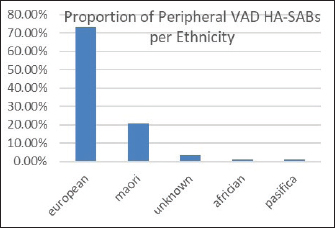 We reviewed rates of peripheral VAD HA-SABs as these are the most common invasive device used for inpatients. The proportion of peripheral VADs HA-SAB in European and Māori was statistically insignificant.