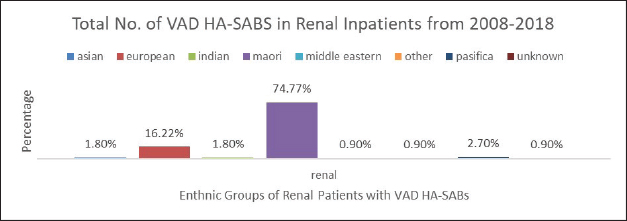 Conclusion: Māori renal patients with VAD’s in WDHB experienced an increased incidence of HA-SABs from 2008 to 2018 in comparison to other ethnic populations. Māori renal patients are 3½ times more likely to suffer VAD HA-SAB than non-Māori patients. NZ data for VAD HA-SABS requires IPC teams to include ethnicity and provide a standardized, correct diagnosis of a VAD HA-SABS. NZ health strategies need to ask well-directed questions in order to progress toward equitable health outcomes.