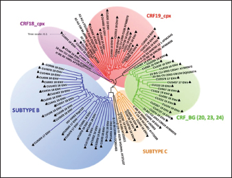 Fig. 2. Phylogenetic tree of the HIV-1 env gene. The analysis included 86 nucleotide sequences, 69 sequenced in the present study and 17 referenced. The evolutionary history was inferred using the maximum likelihood method (PhyML version 3) and the GTR nucleotide substitution model. The inferred consensus tree was used to represent the evolutionary history of the analyzed sequences. The different subtypes are shown in a circular tree with branches indicated in different colors according to the subtype: Blue, subtype B; Orange, subtype C; Green, CRFs_BG (20, 23,24), Red, CRF19_cpx; Violet, CRF18_cpx. The Cuban samples sequenced in this study are marked with a black triangle, the rest are reference sequences of the different subtypes of HIV-1, included in this work. Table 2. Variants of HIV-1 obtained by partial sequencing of two regions of the virus, in the analyzed samples.