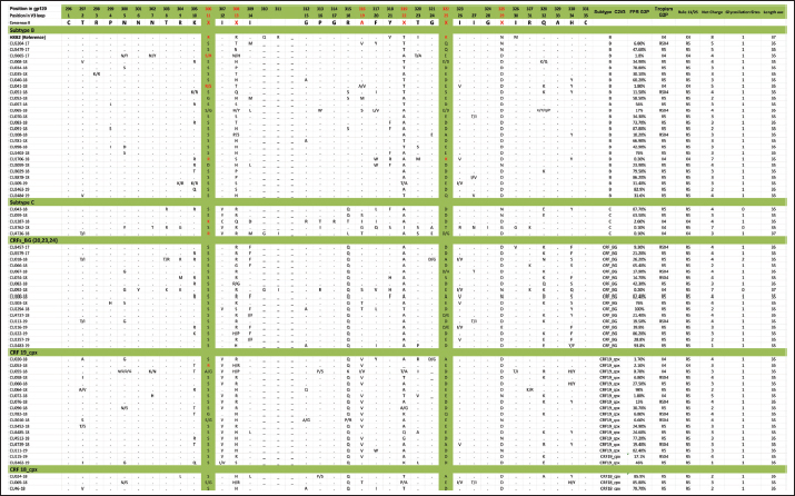 Mutations in the V2 and V3 regions of the envelope protein gp 120, in the Cuban sequence s of HIV-1 mutations in the V2 and V3 loopA comparison of the amino acid sequences of the V3 loop among the 69 samples showed significant differences between the different subtypes. In 40 (57.97%) of the 69 sequences of the env gene, it was possible to analyze the V3 region and V2 variable region. The length of the sequences varied between the samples studied, being CU051-18 the shortest (37 amino acids, subtype B, R5X4 tropism), and CU066-18 the longest (46 amino acids, CRF_BG, R5 tropism). The average length of the sequences was 40.05 amino acids with multiple deletions and insertions, particularly in the hypervariable region. Similar to what was observed for V3, some differences related to the viral subtype were observed in the amino acid sequence (Figs. 5 and 6). Mutations in V2 and V3 are associated with a change in tropism and resistance to MVCWhen analyzing the V3 loop sequences of the 69 samples studied, we were able to observe that, in general, 54 (78.26%) presented at least one mutation associated with resistance to MVC. In the present investigation, the X13H mutation, also called P/T308H, (depending on whether only the position from the beginning of the V3 loop or gp 120 is taken into account) was frequently detected in almost all the viral variants studied, except in subtype C, where I323V was found, although to a lesser extent. The A316T mutation was also present in the non-B subtype samples (except for CRF19_cpx). The G11R mutation was detected in subtype B and C samples (p=0.012 OR: 10.36 CI: 1.15–92.90), while the X13R mutation was frequently observed in non-B subtype samples (p=0.0004 OR: 32.47 CI: 1.89–556.37). The change from A to K at position 25 (A25K) was only observed in a few samples, all of which were subtype B (Figs. 5 and 6). It was shown that the X13R mutation was more frequent in untreated patients than in treated patients, 17/33 (51.52%) (p=0.044, OR: 2.76, CI: 1.02–7.50), and for the rest of the described mutations no significant differences were found. In the V2 region, an extensive bibliographic search was carried out to investigate the mutations related to resistance to co-receptor inhibitors that have been described in various studies. We identified the V169M mutation, detected in five samples of the present study (CU008-18, CU035-18, CU998-18, CU1403-18, and CU2484-19), all of subtype B and with CCR5 tropism. The N192K mutation was also detected in another five samples (CU052-18, CU065-18, CU083-18, CU1706-18, and CU3029-18), all also of subtype B and with variable tropism: three R5, one R5X4, and one X4. Glycosylation patterns in the V3 and V2 loopsThe average of the glycosylation sites found in the V2 and V3 loops of the sequenced Cuban samples was 1.85 and 0.97, respectively. In 66 of 69 V3 loop sequences (95.65%), a single glycosylation site was identified (positions 6–8 of the V3 loop). Only two subtype C samples (CU043-18, CU3762-18) and one CRF_BG (CU092-18) did not show this pattern. Sample CU018-18 presented an additional glycosylation site at positions 32–34 of the V3 loop. Of the 40 samples that underwent V2 analysis, 82.5% (33/40) had two glycosylation sites, 2.5% (1/40) had none or three sites, and 12.5% (5/40) presented only one. Except for four samples (CU5479-17, CU109-19, CU2484-19, and CU4739-18), the rest had a glycosylation site at positions 3–5, but the majority of the glycosylation sites were found at positions 185–190, being mostly the NNXS(T) type pattern. Additionally, two of the samples had patterns at positions 34–38 of V2. When analyzing the net charge, values lower than those reported for the V3 loop (average 1.22) were observed, probably because there is a greater number of negatively charged amino acids (D and E). In our study, no significant differences were detected in the glycosylation patterns related to tropism, or with the viral subtypes. Table 4. Comparison of prediction of co-receptor use between detected HIV subtypes.
