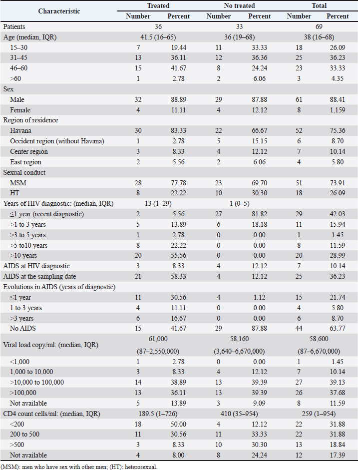 AbstractBackground: Tropism is determined by the ability of HIV-1 to bind to the receptors C-C chemokine receptor type 5 or C-X-C chemokine receptor type 4 (CXCR4) to enter the target cell, which has implications for the pathogenesis of the disease and affects treatment options. This study determined the relationship between the tropism of HIV-1 variants circulating in Cuba, with different variables, and the implications for the use of co-receptor inhibitors. Methods: Plasma samples from 69 of HIV-1 seropositive patients, period 2017–2019, were analyzed. Fragments of the env and pol regions of the virus were sequenced. The subtype and prediction of the viral phenotype, viral mutations, as well as the relationship of the phenotype and subtype with clinical, epidemiological, and virological variables were determined. Results: The recombinant CRF19_cpx (p =0.0234) showed a significant association with viruses that use the X4 and R5X4/X4 Co-receptor, even in untreated patients. Of the viruses studied, 78.26% presented at least one mutation associated with resistance to Maraviroc (MVC), although the patients had not received prior therapy with this drug. Conclusion: The preferential tropism for the CXCR4 co-receptor, detected in the CRF19_cpx variant, accompanied by greater viral replication and unrelated to the time of diagnosis of the patients, reinforces the hypothesis that the viral variant is more pathogenic. The high frequency of polymorphisms and mutations that confer resistance to MVC in the V2 and V3 regions of HIV-1 of the Cuban recombinant forms indicate that there could be a natural resistance to this antiretroviral. Keywords: HIV-1, Maraviroc, Tropism, CXCR4, CRF19_cpx. IntroductionThe variability of the HIV env gene, which plays an important role in infection and antigen recognition, has been the main obstacle to the development of vaccine candidates and new therapeutic strategies. The V3 loop, present in the env gene, is a component of the chemokine receptor-binding region and is the major determinant of Co-receptor usage. The functional importance of V3 lies in the fact that a deletion in it can completely alter the infectivity of the virus. In contrast, V2 is not essential for infectivity; however, it participates in various functions of the env gene associated with escape from neutralization mediated by V3-specific antibodies, due to changes in its length and glycosylation patterns (Zolla-Pazner and Cardozo, 2010). Viral variants that use the C-C chemokine receptor type 5 (CCR5) are characterized in cell cultures for being non-inducing syncytia, having a low replication rate, tropism for macrophages, and predominating in the early stages of infection, being classified as viruses with the R5 phenotype. Those viruses that use the C-X-C chemokine receptor type 4 (CXCR4) for cell entry, mainly infect T cells and stand out for their ability to induce syncytia, have a high replication rate, and predominate in the late stage of the disease, classifying as virus with phenotype X4. At the same time, there is a group of viruses that are classified as having a dual phenotype (R5X4) due to their ability to bind to both the CCR5 and CXCR4 co-receptors. This is considered to be a transitory phase in the evolution of the R5 virus to X4, although phenotypically they behave like X4 viruses (Sede et al., 2014). HIV-1 has demonstrated its ability to change tropism during the course of the disease, a process that the virus adaptively uses to spread in the presence of antivirals (Smyth et al., 2012). Limited access to antiretrovirals (ARVs) in some parts of the world, suboptimal levels of adherence, resistance, and failure of therapy are some of the existing problems that need to be addressed in the management of HIV infection (Aves et al., 2018). Maraviroc (MVC) is the only drug from the group of co-receptor antagonists approved by the Food and Drug Administration of the United States for the treatment of infection with R5 variants of HIV-1. It is the first ARV to target a host protein rather than a viral protein. Its mechanism of action consists of allosteric inhibition of the union of the glycoprotein gp 120 to the co-receptor CCR5, which prevents the virus from entering the cell (Gulick et al., 2008). Although this drug began to be used in 2007, the existence of genetic variants of HIV-1 resistant to MVC has already been reported. Although the mechanisms by which this occurs are not yet clear, it is known that a group of mutations in the V3 loop of the glycoprotein gp 120 are associated with resistance (Westby, 2007). In Cuba, the first HIV cases were diagnosed in 1986. Data from the National Direction of Epidemiology of the Ministry of Public Health (MINSAP, 2020) show that as of December 2021, 37,028 people were infected with HIV. The male sex is the most affected and accounts for the majority of cases 80.8%. Men who have sex with other men (MSM) represent 88.2% of the male sex, and 92.9% of people living with HIV are under treatment (MINSAP, 2020). It is known that the HIV-1 epidemic in Cuba is atypical compared to the rest of America and the Caribbean, where subtype B predominates. A high diversity of HIV-1 genetic variants, including a high rate of circulating recombinant forms (CRFs) characterizes the epidemic in Cuba. Over the last decade, the detection of the viral variation CRF19 cpx has been associated with rapid progression to AIDS, high viral load values, the X4 viral phenotype, and higher levels of RANTES in patients with less than 3 years since diagnosis (Kouri et al., 2015). The objective of this study was to determine the relationship between the tropism of HIV-1 variants circulating in Cuba, in treated and naive patients, with epidemiological, viral, and clinical variables and the implications for the use of co-receptor inhibitors. Materials and MethodsStudy universeThe universe consisted of 69 plasma samples from HIV-1 seropositive patients, 36 untreated and 33 treated wi