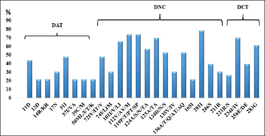 Fig. 1. Most frequent polymorphic positions in the coding region for HIV-1 IN detected in the 23 untreated patients. (DAT): Amino-terminal domain; (DNC): Domain of the catalytic core; (DCT): Carboxyl Terminal Domain.