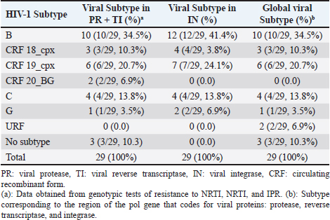 AbstractBackground: Cuban studies show high levels of viral resistance in treated and untreated patients. In 2017, dolutegravir (DTG) was introduced as a rescue therapy in Cuba, and in 2018 as a first-line regimen. The aim of this study was to determine the primary and secondary resistance of HIV-1 to DTG in Cuban patients with multiple resistances. Methods: The sample consisted of 29 patients, of which 23 had not been treated with DTG. The viral RNA isolated from plasma was amplified and the fragment of the pol gene encoding viral integrase (3,854–5,981 bp) was sequenced. The viral subtype of the 29 viruses was determined. Results: No primary resistance mutations to DTG were detected in any patient. The polymorphic positions found with greater frequency in the treated patients were: 112 and 119 (both with 73.9%), 125 (69.5%), and 201 (78.2%). Virological suppression was achieved in 18 out of 23 patients (78.2%) and in 14 out of 23 (60.8%) at 3 and 6 months after the start of treatment, respectively. Of the six patients who had received DTG prior to this study, four (66.7%) developed resistance to integrase inhibitors. The subtypes found were: B (41%), CRF19_cpx (24%), CRF18_cpx and C (both 14%), and G (7%). Conclusion: Primary resistance to DTG was not detected, while secondary resistance was high in those patients who received a single daily dose of the antiviral. It is necessary to delve into the role of some polymorphisms, more frequent in certain subtypes, and their contribution to primary resistance. Keywords: HIV, Integrase inhibitors, Dolutegravir, Multidrug-resistant virus, Cuba. IntroductionHighly effective antiretroviral therapy has changed the treatment of HIV-1 infection (Friedland, 2019). There are five classes of antiretroviral agents (ARVs): nucleoside and nucleotide analog reverse transcriptase inhibitors (NRTI), non-nucleoside reverse transcriptase inhibitors (NNRTI), protease inhibitors (PIs), entry inhibitors (antagonists of coreceptors, fusion inhibitors, and post-fixation inhibitors), and integrase inhibitors (INI) (InfoSida, 2019). As of December 2019, 33,586 people were diagnosed with HIV-1 infection in Cuba. Of them, 27,354 (81.4%) are living with HIV-1 and 94% are receiving TARVAE (MINSAP, 2019). Since the beginning of antiretroviral therapy in 1986, integrase, protease, and reverse transcriptase have been the targets for antiretroviral drug development. In 2007, the first integrase inhibitor was approved: raltegravir (RAL), followed by elvitegravir (EVG), dolutegravir (DTG), and bictegravir (BIC). These compounds are also chain transfer inhibitors (InfoSida, 2019). Integrase is encoded by the HIV-1 pol gene. It has 288 amino acids and three structural domains: the terminal amino (1–49), the catalytic nucleus, (50–211), and the terminal carboxyl (212–288) (Hazuda, 2010). Good patient adherence to treatment can suppress viral replication for decades. The therapy does not eliminate HIV-1 infection, which today is considered a chronic disease, but non-compliance with treatment schedules, drug intolerance, and interactions of ARVs with other drugs that reduce blood levels of the drug below its optimal values can cause treatment failure (Afani and Gallardo, 2011). Another cause of treatment failure is infection with resistant strains. These patients have fewer therapeutic options and are at higher risk of death and complications, particularly in developing countries, where therapeutic options are more limited (Afani et al., 2010). Primary resistance occurs in patients who have not yet received ARV treatment. It occurs due to an infection with a virus that has mutations associated with resistance, currently known as transmitted resistance. From now on, both terms will be used interchangeably. Secondary resistance appears in patients who have undergone antiretroviral treatment and occurs under the selective pressure of ARV drugs (Afani et al., 2010). At the end of 2019, 38 million people were infected with HIV-1 worldwide, of which 25.4 million were receiving some ARV treatment (Onusida, 2019). These figures not only show progress in access to treatment but also underscore the effort that is still needed to reach the 90–90–90 target established by WHO and the Joint United Nations Programme on HIV and AIDS (UNAIDS) (Onusida, 2017), whose purpose is to decrease the transmission of HIV-1 and to open a path toward the elimination of the infection. In 2017, the program proposed that 90% of HIV-1 infected people receiving ARV treatment achieve viral suppression by 2020, and that this percentage should rise to 95% by 2030 (Onusida, 2017). In Cuba by 2017, 23,500 people were living with HIV; of them 4,535 (19.3%) with treatment failure. A genotypic resistance study conducted that year, in which 201 patients with treatment failure were processed, found that 6.4% (13/201) carried multidrug-resistant viruses. In 2018, the number of infected people amounted to 25,494, and 4,130 (16.2%) of them had therapeutic failure. Multidrug-resistant viruses were identified in 0.7% (1/140) of the patients who underwent genotypic tests (HIV Glasgow, 2018). According to the data from the authors’ laboratory, at the end of 2019, 27,099 people were living with HIV, 25,607 were receiving ARV treatment, and 7,093 (27.7%) had therapeutic failure, with viral loads greater than 1,000 copies/ml. Resistance trials showed that 2.4% (2/82) of patients whose viral genotypes were studied had resistance to all antiretroviral families. For these patients, the therapeutic options are limited (Pérez et al., 2017; Kourí, 2019) and drugs that are not produced in the country are needed. In addition, HIV-pretreatment studies have found high levels of transmitted resistance in Cuba (12.5% and 29.8%) (Perez et al., 2013; Machado et al., 2019). For this reason, in 2017, Cuba decided to acquire new drugs, including DTG. Initially, this drug was used in patients with multiple resistance; as of 2018, accor
