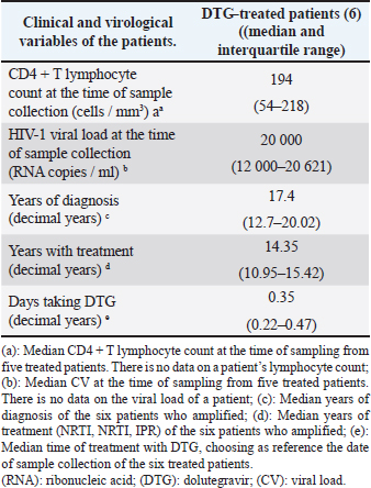 Patients who had been treated with DTG at the beginning of this studyThe genotypic test of resistance to integrase inhibitors carried out on the plasma samples collected before initiating DTG treatment from the six patients already receiving the antiretroviral showed that the amplified viruses were sensitive to the family of integrase inhibitors. In this group of patients, the time under treatment with DTG was very short (from 18 days to 6 months, with the exception of one patient who received it for 2 years) (Table 2), so the variable time of treatment with the ARV was not used in testing. These patients started the study with low CD4+ values and high VL values. The median years of HIV-1 infection and treatment with NRTI, NNRTI, or PI were 17.4 and 14.35 years, respectively (Table 3). Four patients (4/6; 66.7%) carried viruses with mutations that confer resistance to integrase inhibitors (Table 4); three of them with high resistance to the four integrase inhibitors; and one with high resistance to ELV and RAL, and low to DTG and BIC (Table 4). The patient, who was only treated with DTG for 18 days when the sample was received in our laboratory, had previously been treated with RAL. The remaining three treated patients received the drug at a dose of 50 mg/day. Table 3. Clinical characteristics of patients treated with DTG at treated with DTG at baseline