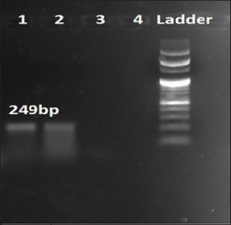 Fig. 2. Amplification of shlA at 249 bp. Lane 1, 2: PCR product showing amplified shlA gene. Lane 3: negative control.