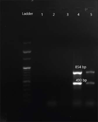 Fig. 3. Amplification of pigP at 207 bp and flhD at 331 bp. Lane 1, 2: PCR product showing amplified pigP gene. Lane 3: negative control. Lane 4: PCR product showing amplified flhD gene. Lane 5: negative control.
