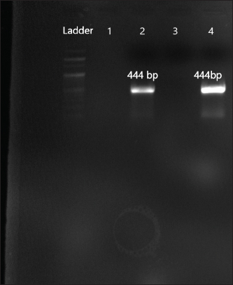 Fig. 6. Amplification of aph(2ʺ)Ic at 444 bp. Lane 2,4: PCR product showing amplified aph(2ʺ)Ic gene. Lane 1: negative control.
