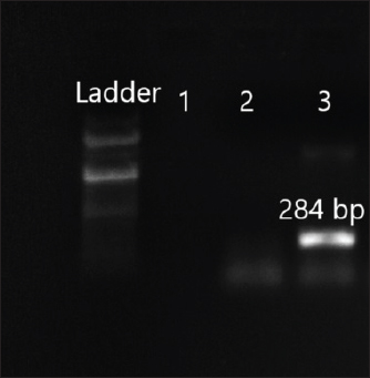 Fig. 7. Amplification of ant(3ʺ)I at 284 bp. Lane 3: PCR product showing amplified ant(3ʺ)I gene. Lane 2: negative control.
