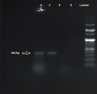 Fig. 8. Amplification of tet(K) at 361 bp. Lane 1, 2: PCR product showing amplified tet(K) gene. Lane 3: negative control. Both the study isolates were also resistant to multiple classes of antibiotics viz., β- lactams, aminoglycosides, and cycline group of drugs harboring different antibiotic resistance determinants. These findings are in concurrence with studies of de Silva et al. (2021), Moradigaravand et al. (2016). Such multiple drug-resistant Serratia strains pose a serious threat to mankind as such drug-resistant patterns would limit the treatment options available for treating life-threatening Serratia infections. Interestingly, this study has also detected an Inc FIB type plasmid which would act as a vehicle for dissemination of such multidrug resistance (MDR) genes. The concurrence of both the virulence genes and antibiotic resistance genes in our study isolates favor the increased survival of such pathogens as antibiotic resistance will limit the treatment option which may lead to the emergence of untreatable illnesses. The current study is a pilot study to investigate different enteric pathogens present within ready-to-eat food samples from this geographical part of the world. Two isolates of S. marcescens resistant to multiple antibiotics as well as harbouring virulence genes were recovered during this study. The multidrug-resistant phenotype of the study isolates and isolation sources as ready-to-eat food samples are unusual. As the presence of such phenotypes is less frequent in food samples, this implies a potential threat of the emergence of an unusual pathogen that may cause enteric diseases and other associated illnesses. Hence, reporting these two virulent MDR isolates is of public health importance to contain their spread. ConclusionIn the current study, antibiotic-resistant virulent S. marcescens was detected in the food sample. The presence of this less frequently isolated pathogen from food samples is of immense importance. The study warrants the necessity of local epidemiological investigations to understand the expansion of this pathogen to the environment and community through food samples further minimizing the threat to public health. AcknowledgmentAuthors acknowledge the infrastructural facilities provided by Advanced Institutional Biotech Hub, Assam University, Silchar, India. Authors’ contributionsSR: Experimental work, formal analysis, and writing draft; JW: Formal analysis; SRC: Sample collection and formal analysis; BJD: Formal analysis; PBM: Manuscript editing and proofreading; AB: Study design, Conceptualization, and Supervision. ReferencesAbbas, H.A. and Hegazy, W.A. 2020. Repurposing anti-diabetic drug “Sitagliptin” as a novel virulence attenuating agent in Serratia marcescens. PLoS One 15(4), e0231625. Aggarwal, C., Paul, S., Tripathi, V., Paul, B. and Khan, M.A. 2017. Characterization of putative virulence factors of Serratia marcescens strain SEN for pathogenesis in Spodoptera litura. J. Invertebr. Pathol. 143, 115–123. Campos, J., Gil, J., Mourão, J., Peixe, L. and Antunes, P. 2015. Ready-to-eat street-vended food as a potential vehicle of bacterial pathogens and antimicrobial resistance: an exploratory study in Porto region, Portugal. Int. J. Food. Microbiol. 206,1–6. Carattoli, A., Bertini, A., Villa, L., Falbo, V., Hopkins, K.L. and Threlfall, E.J. 2005. Identification of plasmids by PCR-based replicon typing. J. Microbiol. Methods. 63(3), 219–228. CLSI. (2022). Performance standards for antimicrobial susceptibility testing 27th ed. CLSI supplement M100. Wayne, PA: Clinical and Laboratory Standards Institute. Dallenne, C., Da Costa, A., Decré, D., Favier, C. and Arlet, G. 2010. Development of a set of multiplex PCR assays for the detection of genes encoding important β-lactamases in Enterobacteriaceae. J. Antimicrob. Chemother. 65(3), 490–495. da Silva, K.E., Rossato, L., Jorge, S., de Oliveira, N.R., Kremer, F.S., Campos, V.F., da Silva Pinto, L., Dellagostin, O.A. and Simionatto, S. 2021. Three challenging cases of infections by multidrug-resistant Serratia marcescens in patients admitted to intensive care units. Braz. J. Microbiol. 52(3), 1341–1345. Khater, D.F., Lela, R.A., El-Diasty, M., Moustafa, S.A. and Wareth, G. 2021. Detection of harmful foodborne pathogens in food samples at the points of sale by MALDT-TOF MS in Egypt. BMC. Res. Notes. 14(1), 1–6. Li, S., Meadow Anderson, L., Yang, J.M., Lin, L. and Yang, H. 2007. DNA transformation via local heat shock. Appl. Phys. Lett. 91(1), 1–3. Melo, D.H., Souza, B.V., Nascimento, J.S., Amorim, A.M., Medeiros, L.M. and Mattoso, J.M. 2018. A reddish problem: antibiotic-resistant Serratia marcescens in dairy food commercialized in Rio de Janeiro. Int. J. Food. Microbiol. 25(2), 880–883. Moradigaravand, D., Boinett, C.J., Martin, V., Peacock, S.J. and Parkhill, J. 2016. Recent independent emergence of multiple multidrug-resistant Serratia marcescens clones within the United Kingdom and Ireland. Genome. Res. 26(8), 1101–1109. Naas, T., Cuzon, G., Villegas, M.V., Lartigue, M.F., Quinn, J.P. and Nordmann, P. 2008. Genetic structures at the origin of acquisition of the β-lactamase bla KPC gene. Antimicrob. Agents. Chemother. 52(4), 1257–1263. Paul, D., Mazumder, N.B., Wangkheimayum, J. and Bhattacharjee, A. 2021. Report of a carbapenemase gene blaIMP-4 in multi-drug resistant Escherichia coli from sewage water: a threat on clinical-environmental interphase. Indian. J. Med. Microbiol. 39(4), 556–557. Poirel, L. and Nordmann, P. 2006. Genetic structures at the origin of acquisition and expression of the carbapenem-hydrolyzing oxacillinase gene bla OXA-58 in Acinetobacter baumannii. Antimicrob. Agents. Chemother. 50(4), 1442–1448. Rasmussen, B.A., Bush, K., Keeney, D., Yang, Y., Hare, R., O’Gara, C. and Medeiros, A.A. 1996. Characterization of IMI-1 beta-lactamase, a class A carbapenem-hydrolyzing enzyme from Enterobacter cloacae. Antimicrob. Agents. Chemother. 40(