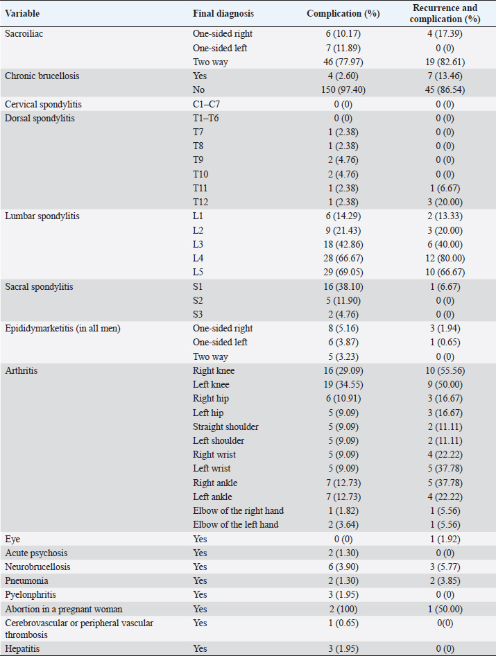 In the complication group, 81 (32.5%) men and 43 (34.68%) women were rural, and in the relapse and complication group, 7 (77.78%) men and 2 (22.22%) women were urban. Only one case of a nomadic female patient was registered in the complication group. A total of 85 patients (34.27%) were treated at the time of referral and 163 patients (65.73%) presented without a history of treatment. The duration of the disease based on the final diagnosis of brucellosis varied from a minimum of 3 days to a maximum of 365 days with an average of 56.61 days. Table 2. Comparison of organ involvements in brucellosis patients in complication, and relapse-complication groups.