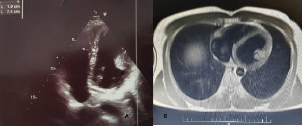 Fig. 2. (A) Echocardiography of patient. (B) Chest MRI shows a mass in the heart. Obtaining a detailed history, epidemiological information, clinical symptoms of the patient, serological tests, and any morphological lesions discovered by ultrasound, CT, and MRI are the main tools for diagnosing this disease (Nabah et al., 2012). In the latest articles published in prestigious international journals, this disease is still one of the causes of problems in the central nervous system, and it requires careful attention from the health system staff (Ju and Liu, 2023; Sumit and Sunil, 2023). ConclusionConsidering a large number of patients and the effects of echinococcosis, it can be said that this disease is neglected and less reported because it takes a long time for the clinical symptoms of this disease to appear, and on the other hand, reservoirs of infection in domestic animals and wildlife have caused It is difficult to manage from the aspect of public health. Also, we strongly recommend for properly diagnose hydatid cyst disease, a thorough examination of all possible sites of involvement is necessary, even if the patient has no symptoms ReferencesAhmed, S.K., Essa, R.A. and Bapir, D.H. 2022. Uniportal video-assisted thoracoscopic surgery (u-vats) for management of pulmonary hydatid cyst: a systematic review. Ann. Med. Surg. 75, 103474; https://doi.org/10.1016/j.amsu.2022.103474 Asri, F., Tazi, I., Maaroufi, K., El Moudden, A., Ghannane, H. and Ait Benali, S. 2007. Cerebral hydatic cyst and psychiatric disorders. Two cases. L’ Encephale 33(2), 216–219; https://doi.org/10.1016/s0013-7006(07)91553-5 Baumann, S., Shi, R., Liu, W., Bao, H., Schmidberger, J., Kratzer, W. and Li, W. 2019. Worldwide literature on epidemiology of human alveolar echinococcosis: a systematic review of research published in the twenty-first century. Infection 47(5), 703–727; https://doi.org/10.1007/s15010-019-01325-2 Dong, Z., Yusup, M., Lu, Y. and Tang, B. 2022. Hydatid cyst of the heart as a rare cause of arrhythmia: a case report and review of published reports. Heart. Rhythm. Case Rep. 6, 458–462; https://doi.org/10.1016/j.hrcr.2022.04.004 da Silva, A.M. 2010. Human echinococcosis: a neglected disease. Gastroenterol. Res. Pract. 2010, 583297; https://doi.org/10.1155/2010/583297 Eckert, J. and Thompson, R.C.A. 2017. Historical aspects of echinococcosis. Adv. Parasitol. 95, 1–64; https://doi.org/10.1016/bs.apar.2016.07.003 Ju, H. and Liu, C. 2023. Cerebral alveolar echinococcosis. N. Engl. J. Med. 388(5), 453; https://doi.org/10.1056/NEJMicm2202196 Lu, Y.M., Zhang, L., Xing, Q., Zhou, X.H., Li, Y.D, Zhang, J.H, Zukela, T. and Tang, B.P. 2019. Ventricular tachycardia as the initial symptom of cardiac hydatidosis. Chin. Med. J. 132(22), 2765–2766; https://doi.org/10.1097/CM9.0000000000000520 Nabah, K., Mezzoug, N., Oufdou, H., Abrini, J. and Rharrabe, K. 2012. Epidemiological profile of echinococcosis in Morocco from 1980 to 2008. Ann. Biol. Clin. 70 (4), 457–461; https://doi.org/10.1684/abc.2012.0727 Parandin, F., Heydarpour, F., Mohebali, M., Hanafi-Bojd, A.A., Sari, A.A., Zeynali, M., Alizadeh, A., Nazari, N., Kaveh F. and Rokni, M.B. 2021. Estimation of burden of cystic Echinococcosis in Iran using disability adjusted life years (DALYs) in 2018. Iran. J. Public Health 50, 2302–2308; https://doi.org/10.18502/ijph.v50i11.7586 Svrckova, P., Nabarro, L., Chiodini, P.L. and Jäger, H.R. 2019. Disseminated cerebral hydatid disease (multiple intracranial Echinococcosis). Pract. Neurol. 19(2), 156–163; https://doi.org/10.1136/practneurol-2018-001954 Sumit, T. and Sunil, A. 2023. Cerebral cystic Echinococcosis. N. Engl. J. Med. 388(5), e10; https://doi.org/10.1056/NEJMicm2208104 | ||